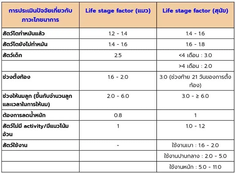 การประเมินปัจจัยเกี่ยวกับภาวะโภชนาการ Life stage factor (แมว) Life stage factor (สุนัข)